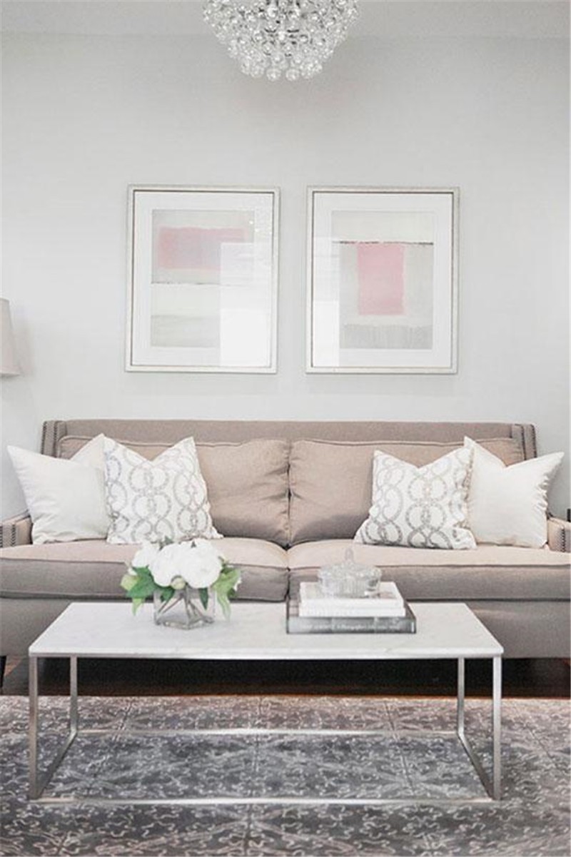 客厅配色选择了淡雅柔和的色彩,让空间气质更加优雅。白色墙面为基底,浅灰色沙发与深灰色地毯构建出空间层次,两幅装饰画组成沙发背景墙,简约中不失时尚。