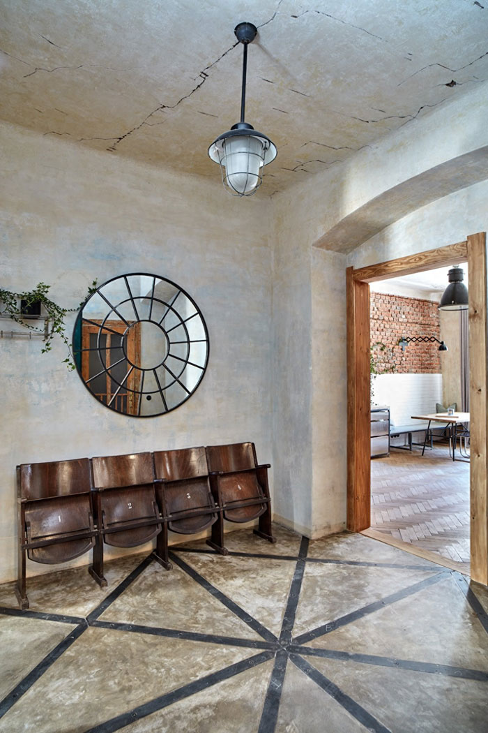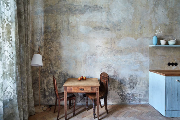 房屋老化,抹灰的墙面出现了泛黄发黑的问题,只做了简单的翻新处理,保留了旧公寓的味道,斑驳的墙面远看就像一幅意境悠长的壁画,且与一旁的窗帘相映成趣。