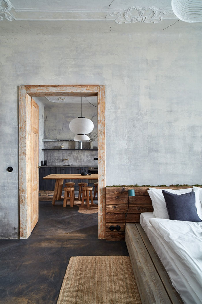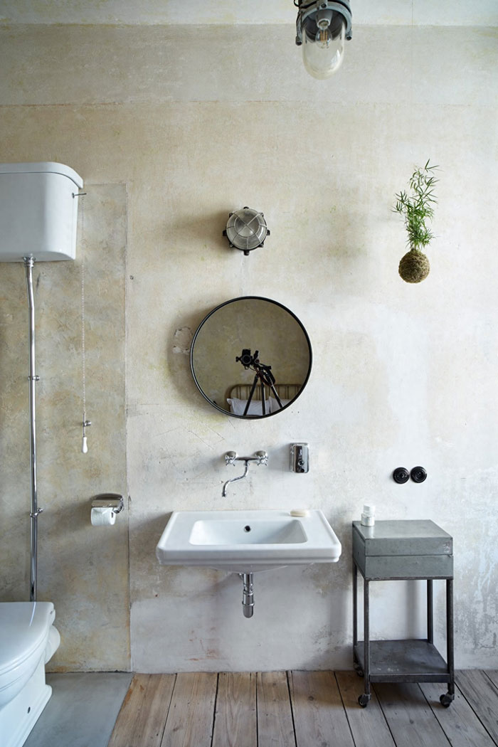 卫生间内做了简单的干湿分离,湿区是混凝土,干区是木地板。老旧粗糙的墙地面配上精致现代的卫浴设备,依然是新旧碰撞的怪诞风格。