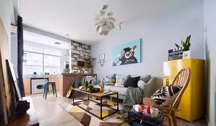 别看屋子比较小,冰箱,沙发,洗衣机,餐厅吧台都齐全了,一幅简单的漫画就让客厅充满生活气息。