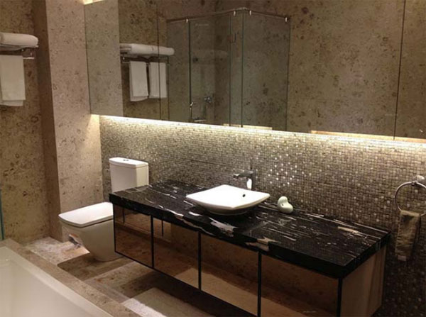 卫生间属于相对狭小空间,落脚地有限,可以将卫生间的梳妆台、储物柜等家具抬离地面,不让其任意侵占空间。同时,因为悬浮的家具会制造出空间无限的错觉,所以,选择尽可能多储物空间的梳妆台,可有效规整卫生间的生活用品。