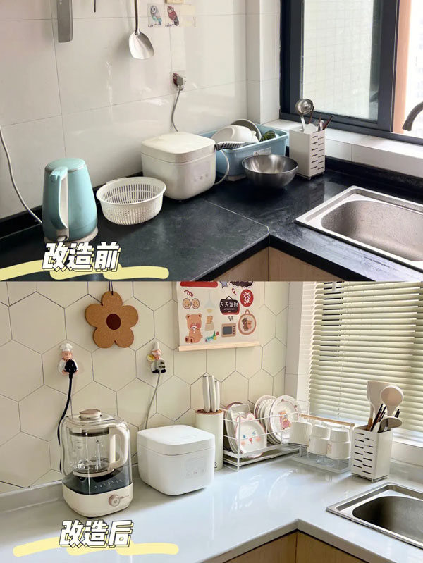 老厨房最碍眼的是黑砖缝配白瓷砖。其实如果砖缝干净,瓷砖老气一点也不会显得难看。因此西安厨房翻新专家建议屋主用勾缝剂或白水泥重新填一次砖缝。如果墙砖表面脏兮兮的,屋主得先彻底清洁砖面,才能修补砖缝。顺带不客气的说,厨房油乎乎的墙面跟屋主烹饪时使用多少油没多大关系,其实跟抽油烟机的马力和屋主的清洁习惯更有关系。现在的抽油烟机马力都很足,老厨房首先要考虑更换掉十几二十年前安装的抽油烟机。同时,屋主要保持良好的清洁习惯。如果每晚洗碗后能顺便抹一把灶面挨着的墙面,每月再彻底清洁一次,厨房墙面会一直保持干净。